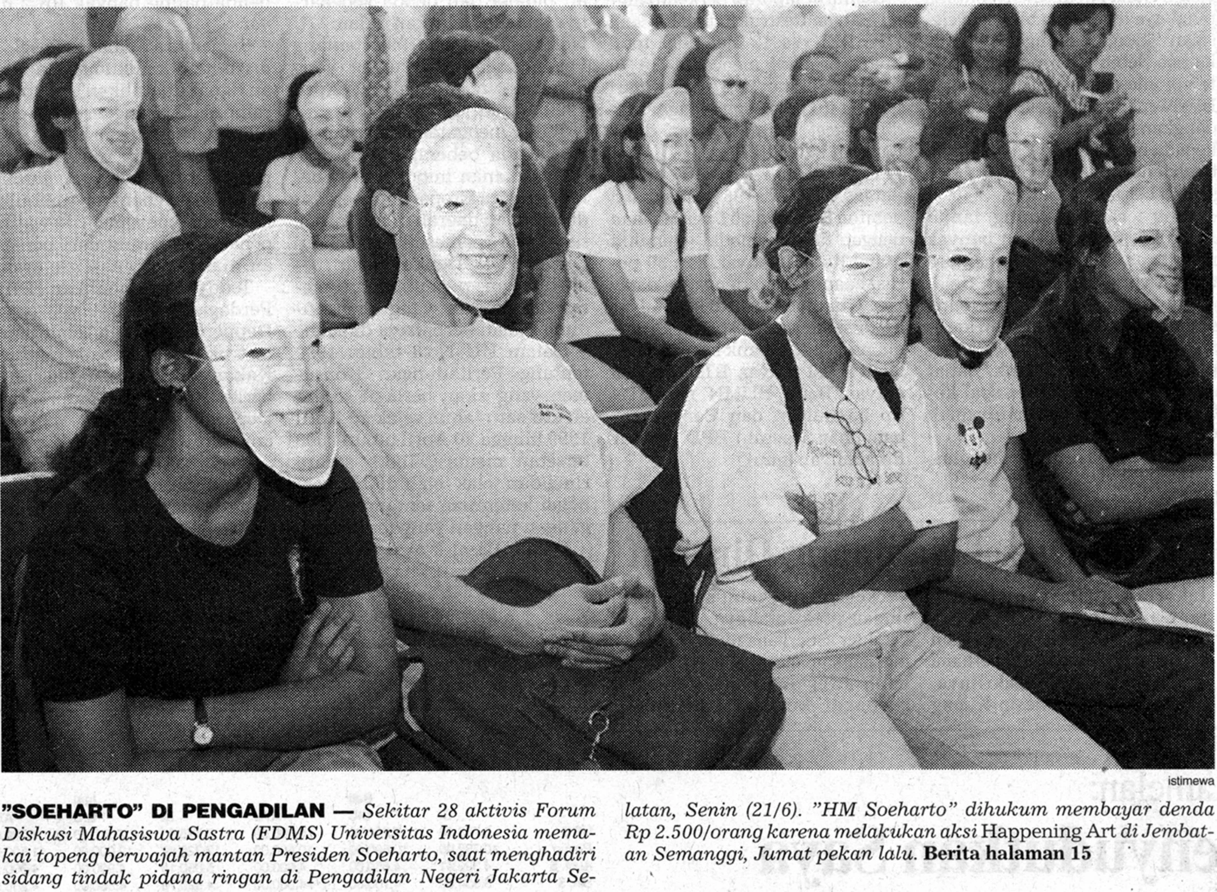 Students appear in court wearing Suharto masks. From “’HM Soeharto’ Dihukum Denda” (Suharto sentenced with a fine), Kompas, June 22, 1999. Courtesty of Karen Strassler and Duke University Press.